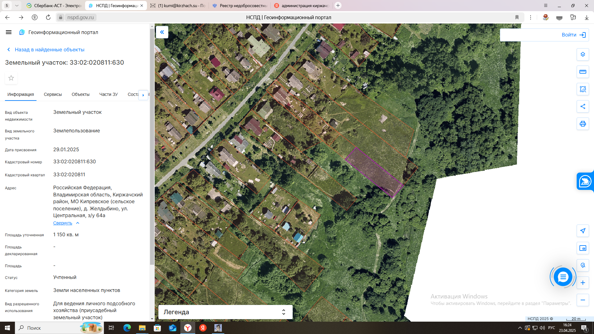 электронный аукцион на право заключения договора аренды земельного участка на срок 20 лет с кадастровым номером 33:02:020811:630 площадью 1150 кв. м, из категории земель населенных пунктов, с разрешенным использованием: для ведения личного подсобного хоз