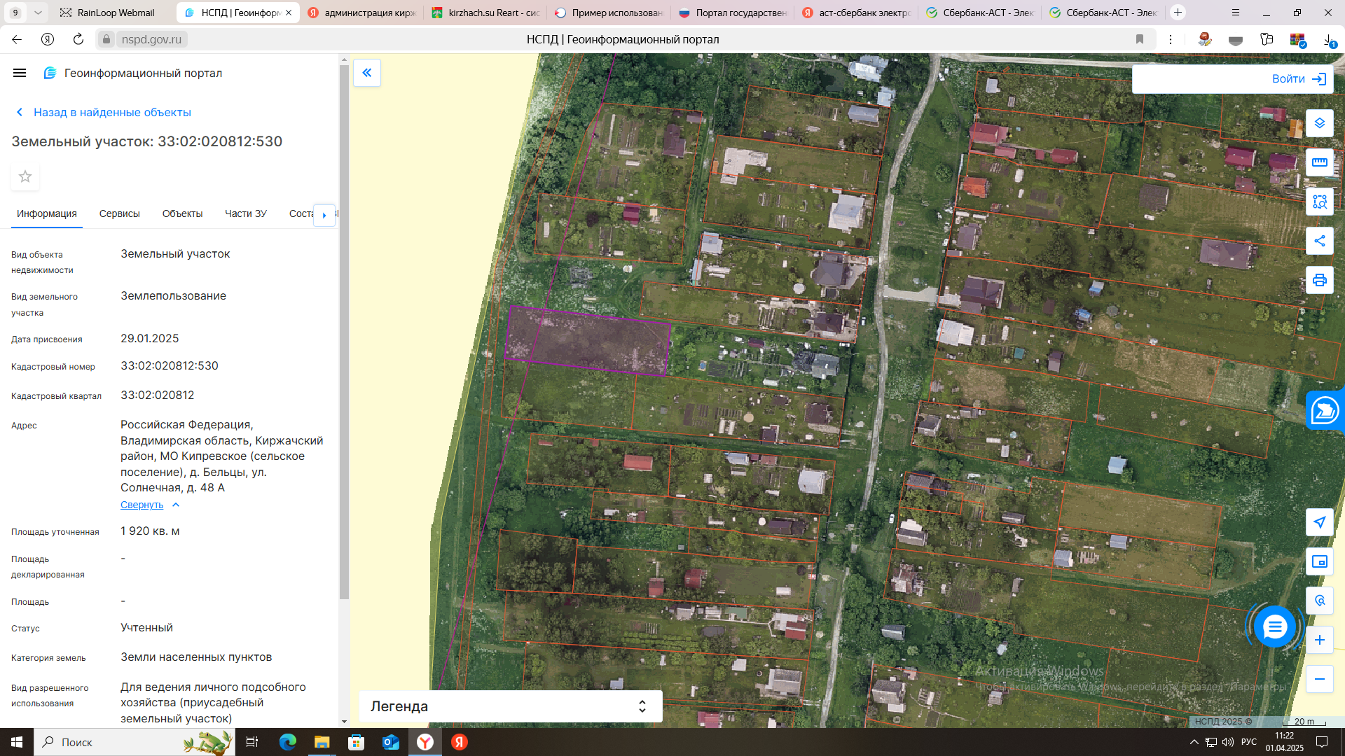электронный аукцион на право заключения договора аренды земельного участка на срок 20 лет с кадастровым номером 33:02:020812:530 площадью 1920 кв. м, из категории земель населенных пунктов, с разрешенным использованием: для ведения личного подсобного хозяйства (приусадебный земельный участок), расположенного по адресу: Российская Федерация, Владимирская область, Киржачский район, МО Кипревское (сельское поселение), д. Бельцы, ул. Солнечная, д.48 А