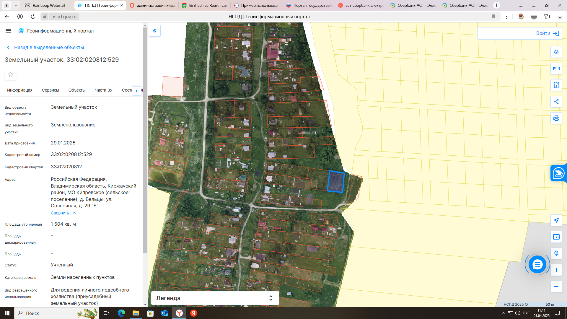электронный аукцион на право заключения договора аренды земельного участка на срок 20 лет с кадастровым номером 33:02:020812:529 площадью 1504 кв. м, из категории земель населенных пунктов, с разрешенным использованием: для ведения личного подсобного хозяйства (приусадебный земельный участок), расположенного по адресу: Российская Федерация, Владимирская область, Киржачский район, МО Кипревское (сельское поселение), д. Бельцы, ул. Солнечная, д.29 «Б».